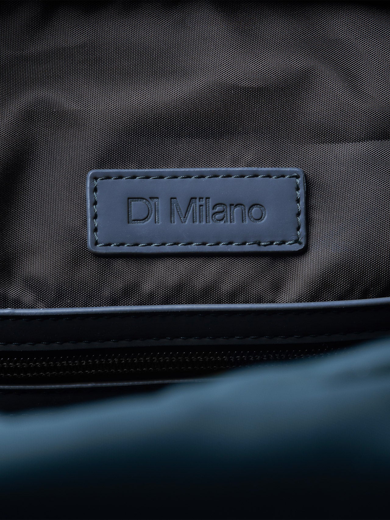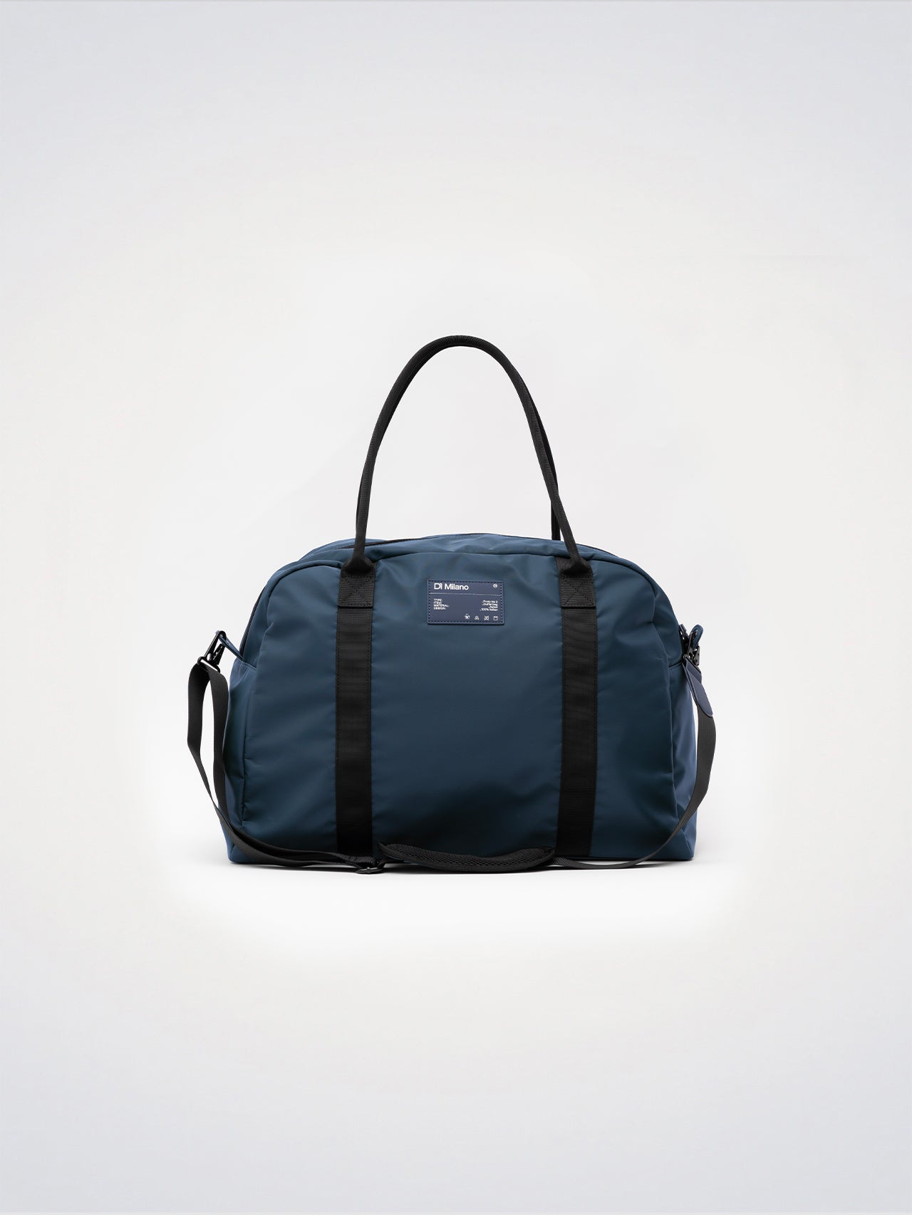 Blue nylon travel bag with essential contemporary design, spacious main compartment, internal zip pocket, structured handles and removable shoulder strap.